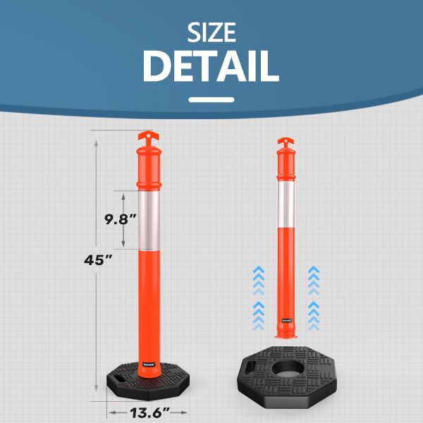Durable & Stable - The large rubber base size of 45-inch-tall delineator road cones is 13.6” X13.6” and weighed 10lb.