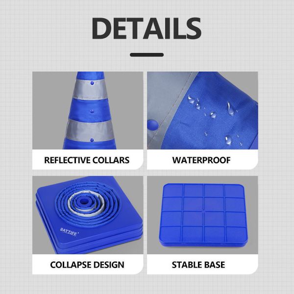 [Premium materials] - The Collapsible traffic cones are made of oxford fabric and PVC material for the basis (don't get run over by cars). The high-quality oxford fabric makes the collapsible traffic cone dry quickly and does not fade easily when exposed to the sun. The bright blue safety color and a 360-degree reflective strip make the traffic cones visible from a long distance during day or night.