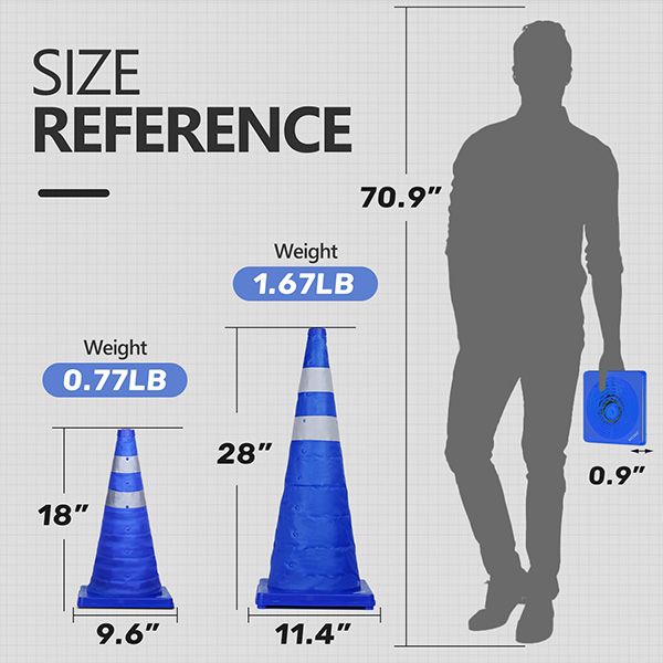 [Stable] - The large base size of Collapsible traffic cones is 9.6" X 9.6" which makes the collapsible traffic cones stay stable in the road. The weight of each road cone is 0.77lb