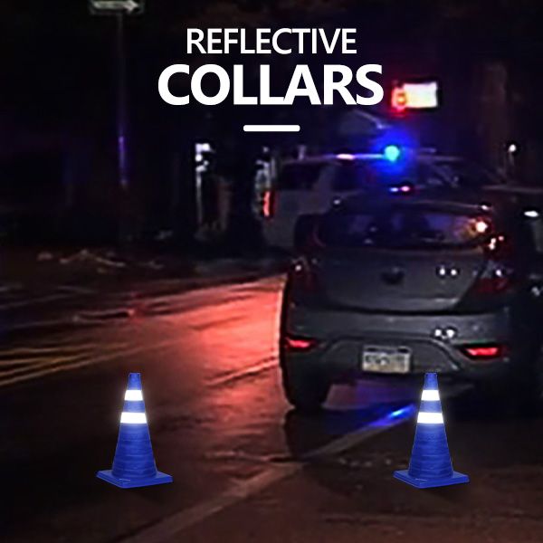 [Premium materials] - The Collapsible traffic cones are made of oxford fabric and PVC material for the basis (don't get run over by cars). The high-quality oxford fabric makes the collapsible traffic cone dry quickly and does not fade easily when exposed to the sun. The bright blue safety color and a 360-degree reflective strip make the traffic cones visible from a long distance during day or night.