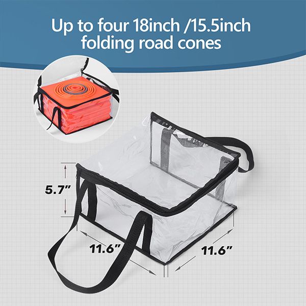 Size - Unfold: 11.6”* 11.6” * 5.7”, Up to 4 of 18 inch/ 15.5 inch collapsible traffic cones can be packed. After folding: 11.6”* 11.6” * 0.78”. Weight: 0.21lb.