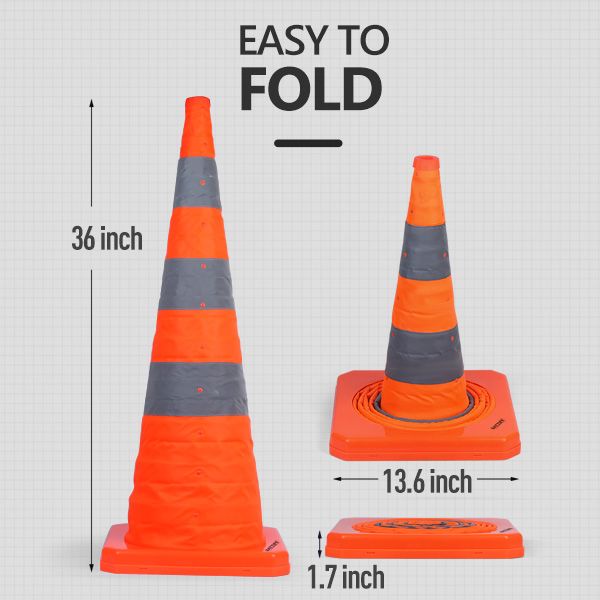[Collapse design & Easy storage] - Each collapsible traffic cones can collapse up to 36" and collapses down to 1.8" in height for easy storage which only takes a small space in your car or garage. Carry the traffic cones conveniently.