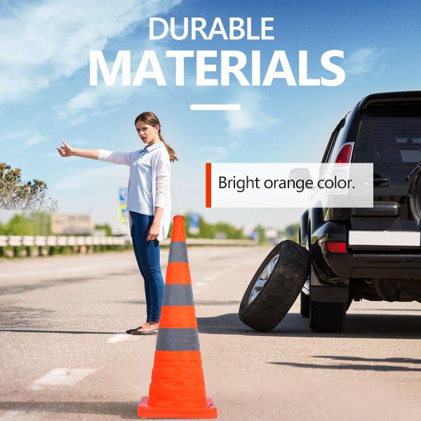 [Durable materials] - The Collapsible traffic cones are made of orange oxford fabric and PVC material for the basis. The high-quality oxford fabric makes the collapsible traffic cone dry quickly and does not fade easily when exposed to the sun. The Bright orange safety color and a 360-degree reflective strip make the traffic cones visible from a long distance during day or night.
