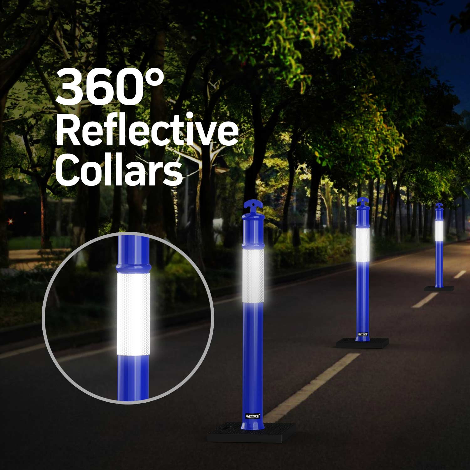 Striking reflective strip: With a 9.8 " hidden reflective strip, the blue safety delineator post cones are highly visible during the day or night. Cordoned off or work zones may be designated on public notice places or private areas, or safe areas may be designated for driving practice