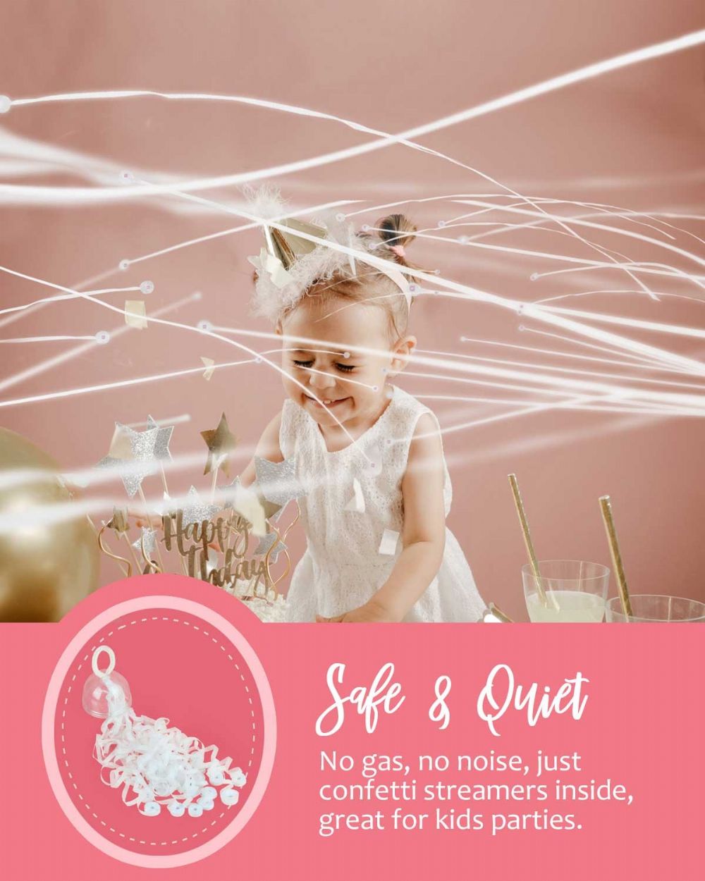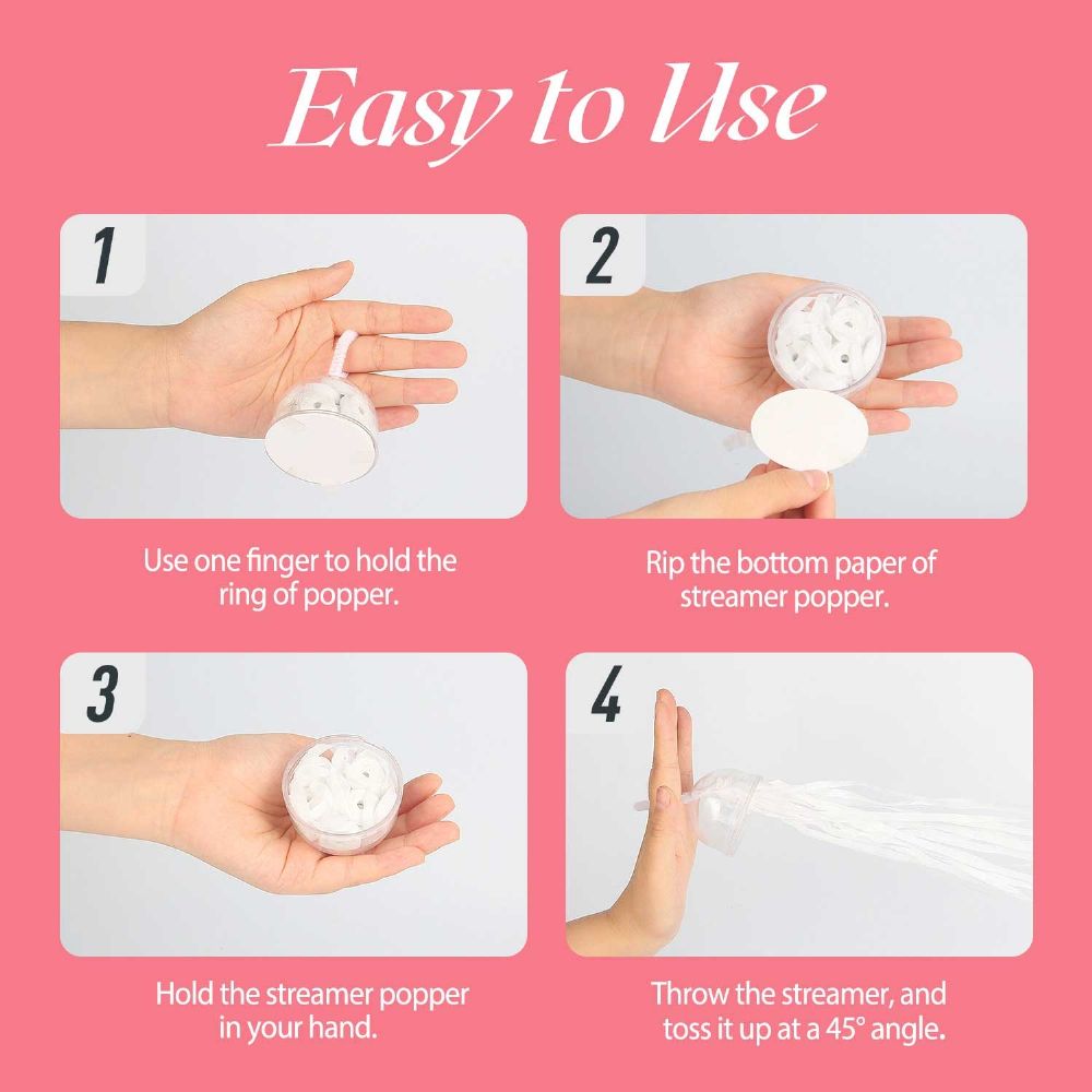 Easy to Use - First of all, use one finger to hold the ring of popper, then tear the paper in the bottom of streamers, then hold the streamers in your hand, throw them away like a magic trick when the party is on. It's great for party decoration, much more safe than confetti cannon or confetti poppers, easy to pop out, no mess and easy to clean up after party.