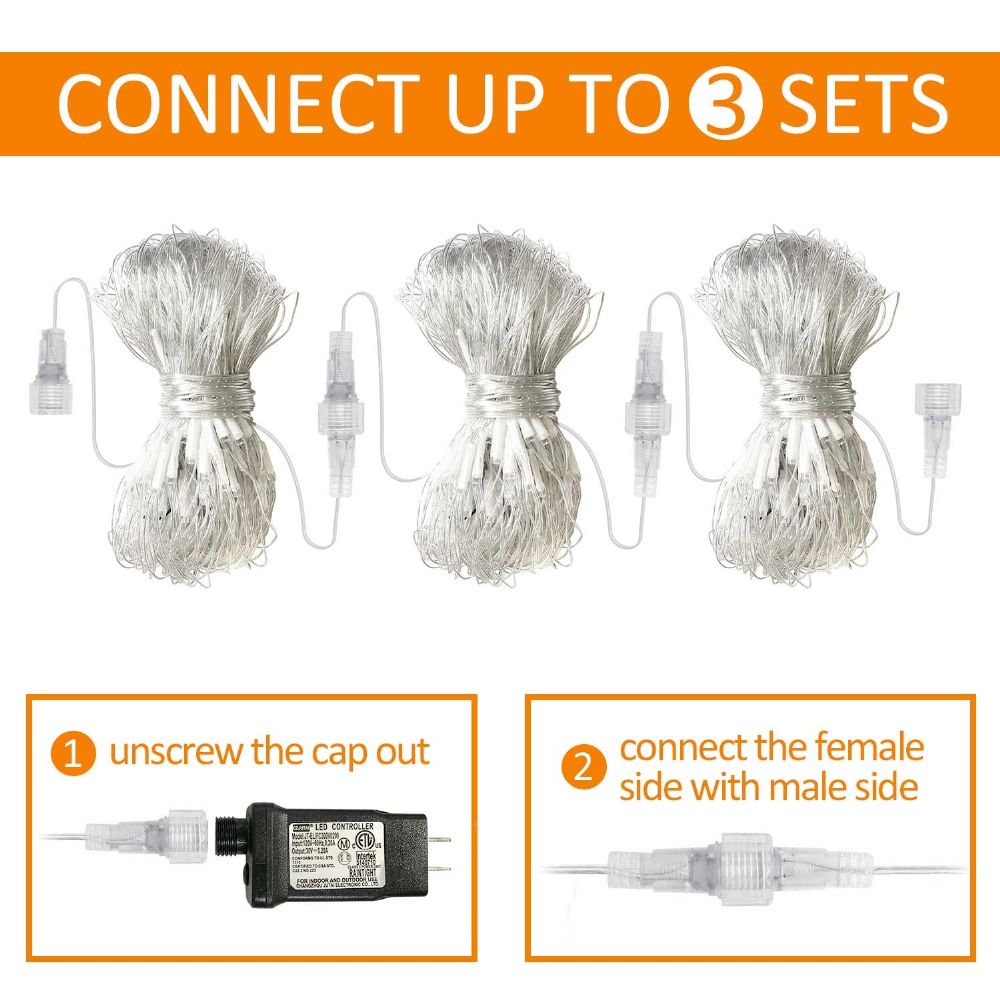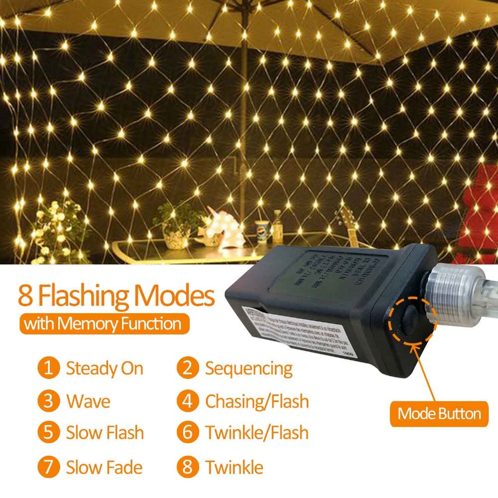 🎉8 Flashing Modes with Memory Function - 200 Super bright LEDs with UL Certified adapter. The size of mesh panel is 10ft*6.6ft with 9.8ft lead cable. End to end connectable, connect up to 3 sets.The orange mesh string lights have 8 different Modes: Steady on, Sequencing, Wave, Chasing/Flash, Slow flash, Twinkle/Flash, Slow fade,Twinkle. Build in Memory chip save your last mode setting and no need to reset mode every time.