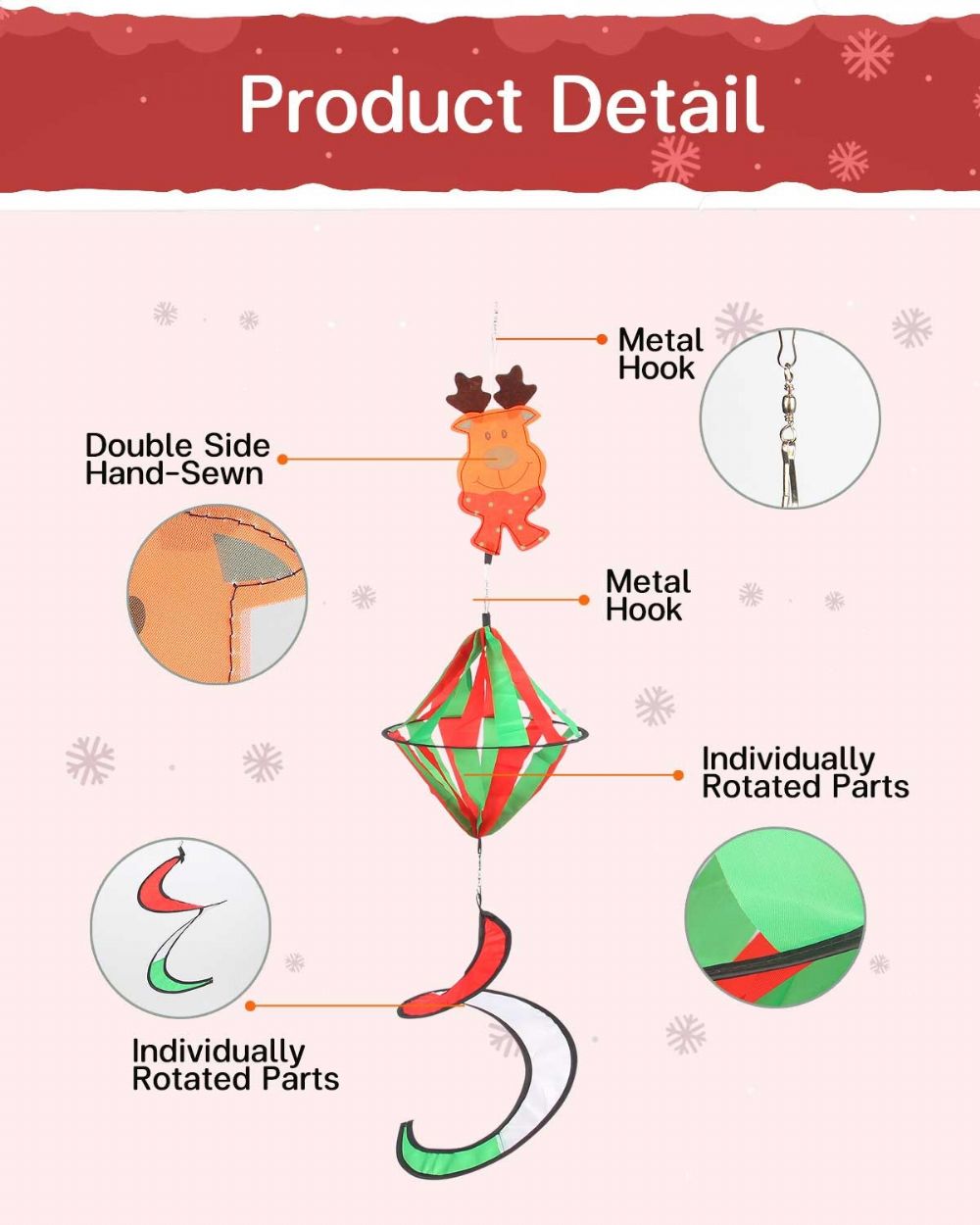 Christmas Elements Design & Material: The wind Sporal use classic and representative Santa Claus and reindeer pattern, sewn with high quality polyester fabric, using metal hook to connect the spiral part with the pattern part, adding Christmas atmosphere to your garden.