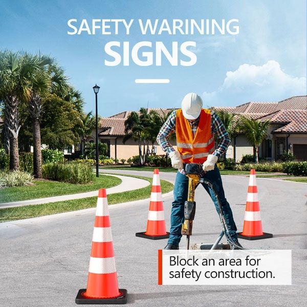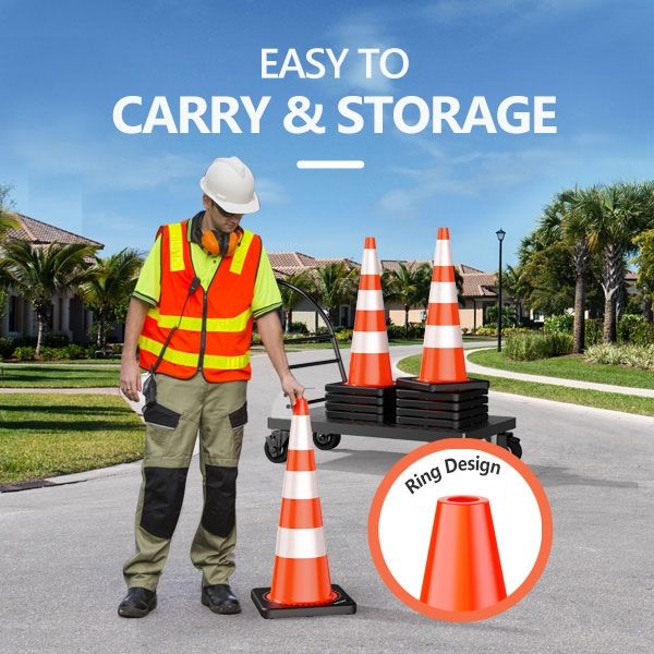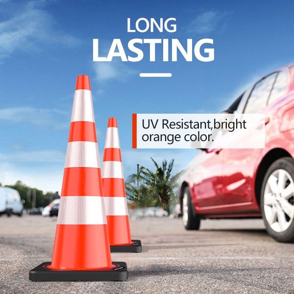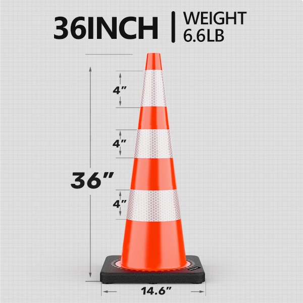 【BLACK WEIGHTED BASE】 The safety cones stand at 36 inches tall with a heavy black rubber base, making people and cars cannot knock down the traffic cones easily. Stable in windy, high temperature, sun burning, bad weather conditions.