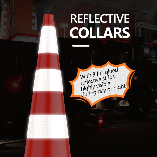 【3 HIGHLY VISIBLE REFLECTIVE COLLARS】These orange safety cones with bright colors and 3 high reflective strips make the traffic cones highly visible during day or night. 360 degrees of visibility is a significant alternative even in fog, rain, snow, or other bad conditions.