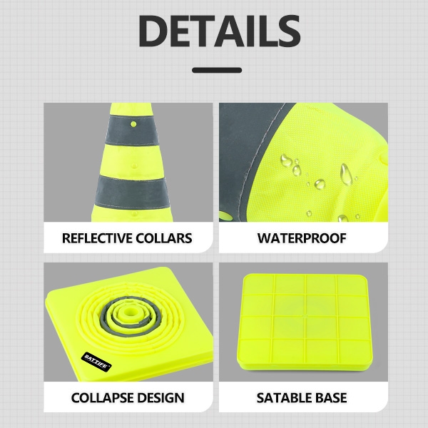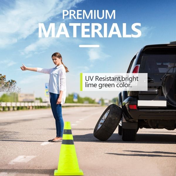 [Premium materials] - The Collapsible traffic cones are made of oxford fabric and PVC material for the basis (don't get run over by cars). The high-quality oxford fabric makes the collapsible traffic cone dry quickly and does not fade easily when exposed to the sun. The Bright lime green safety color and a 360-degree reflective strip make the traffic cones visible from a long distance during day or night.