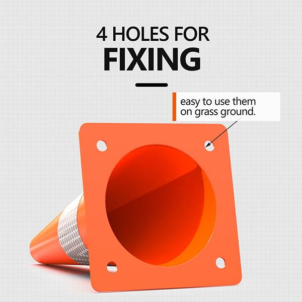 LIGHTWEIGHT - The base size of small cones is 7.8” X 7.8”, and the weight of each cone is 0.2kg/0.44lb. Each road cone base has 4 holes for fixing, so you can easy to use them on grass ground.
