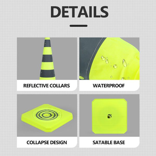 [Durable materials] - The Collapsible traffic cones are made of Lime green oxford fabric and PVC material for the basis. The high-quality oxford fabric makes the collapsible traffic cone dry quickly and does not fade easily when exposed to the sun. The Bright green safety color and a 360-degree reflective strip make the traffic cones visible from a long distance during day or night.