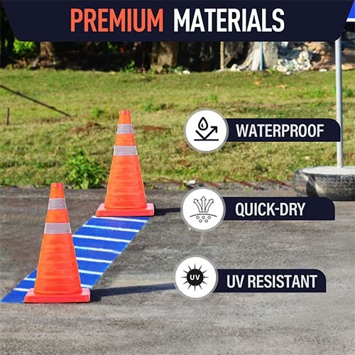 [Premium materials] - The Collapsible traffic cones are made of orange oxford fabric and PVC material for the basis. The high-quality oxford fabric makes the collapsible traffic cone dry quickly and does not fade easily when exposed to the sun. The Bright orange safety color and a 360-degree reflective strip make the traffic cones visible from a long distance during day or night.