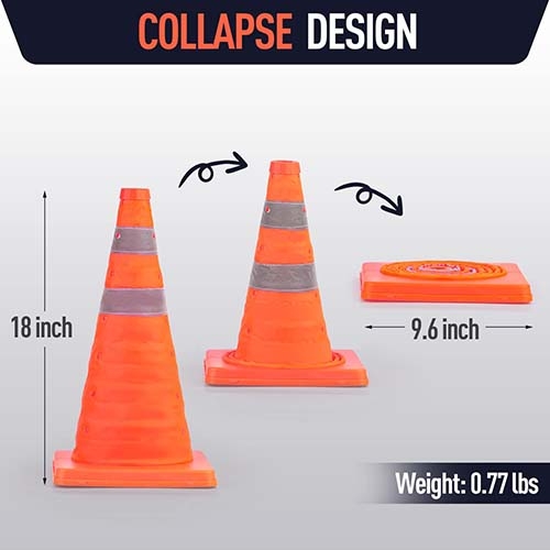 [Collapse design & Easy storage] - Each collapsible traffic cones can collapse up to 18" and collapses down to 0.9" in height for easy storage which only takes a small space in your car or garage. Carry the traffic cones conveniently.