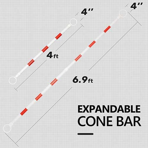 • 【RETRACTABLE】 The 20 Pack lightweight retractable cone bars can extend from 4ft to 6.9ft which easy to adjust the distance between two traffic cones and easy to relocate work area in the outside.